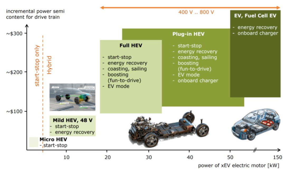 从微混型仅用于启停功能,到全电动车所需能量回收及车载充电,对功率器件需求量增大。