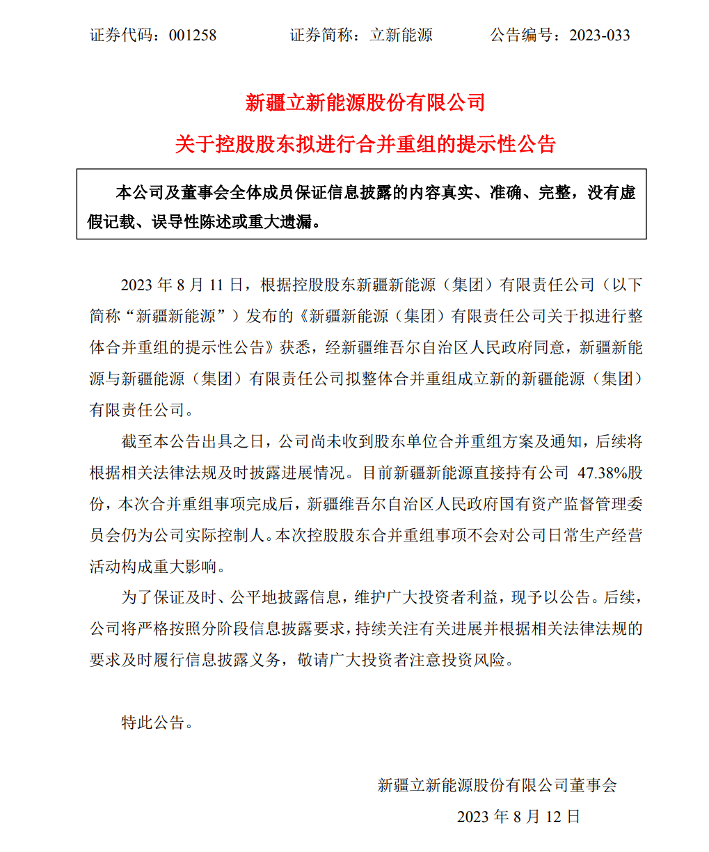 8月12日,新疆立新能源股份有限公司发布了重要的公告称,8 月11日,根据控制股权的人新疆新能源(集团)有限责任公司(以下简称“新疆新能源”)发布的《新疆新能源(集团)有限责任公司关于拟进行整体合并重组的提示性公告》获悉,经新疆尔自治区人民政府同意,新疆新能源与新疆能源(集团)有限责任公司拟整体合并重组成立新的新疆能源(集团)有限责任公司。