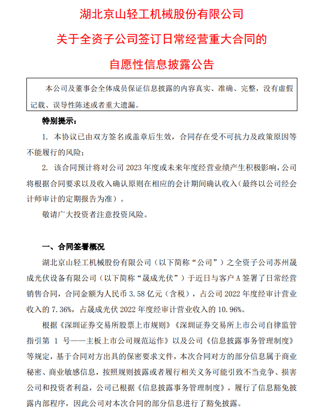 京山轻机公告,全资子公司晟成光伏与客户A签署了日常经营销售合同,合同金额为3.58亿元(含税),占公司2022年度经审计营业收入的7.36%,占晟成光伏2022年度经审计营业收入的10.96%。