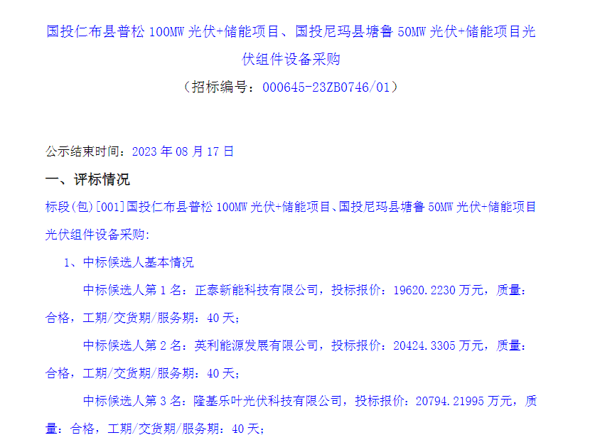 近日,国投仁布县普松100MW光伏+储能项目、国投尼玛县塘鲁50MW光伏+储能项目光伏组件设备采购中标候选公示。中标候选人第 1名:正泰新能科技有限公司,投标报价: 19620.2230 万元,折合单价1.22元/瓦;中标候选人第 2 名:英利能源发展有限公司,投标报价: 20424.3305 万元,折合单价1.27元/瓦;中标候选人第 3 名:隆基乐叶光伏科技有限公司,投标报价: 20794.21995 万元,折合单价1.293元/瓦。
