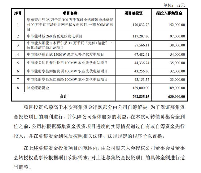 当日,太阳能披露的募集说明书显示,本次可转债募集资金不超过63亿元(含本数),在扣除发行费用后的净额将用于光伏电站项目建设及补充流动资金。据介绍,本次募投项目的实施将加强完善公司在光伏电站领域的产业布局。