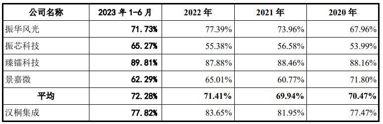 但这种情况下,公司的毛利率明显高于同行,报告期内(2020年至2022年,及2023年上半年),汉桐集成主营业务毛利率分别是77.47%、81.95%、83.65%和77.82%,处于较高水平。四家可比公司平均毛利率则分别是70.47%、60.94%、71.41%和72.28%,各期要比汉桐集成低上约5至20个百分点。