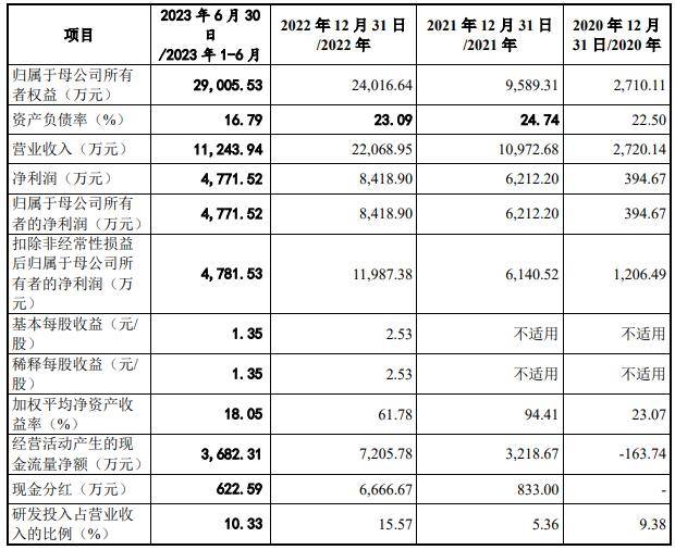 业绩的增长则更为迅猛,2020年公司营业收入为2720万元,2022年录得2.2亿元,两年增长6倍多,2023年上半年营收更录得1.12亿元。公司2020年的净利润只有395万元,到2022年来到8419万元,两年增长了约20倍,2023年上半年公司净利润则为4771万元。