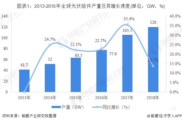 作为光伏行业的终端产品,组件生产与市场结合紧密,产品更新换代较快,要求有很强的市场应变机制,对设计开发能力有一定的要求较高。近年来,全球光伏组件产量持续增长,上涨的速度均在20%以上。2018年,全球光伏组件产量虽继续增长至120GW,但上涨的速度有所放缓,仅为13.7%。伴随着光伏产业的整体情况良好以及组件价格下降使得光伏发电成本不断逼近甚至达到平价上网,预计2019年全球组件产量将会继续呈现增长势头,全年仍将保持在120GW左右。
