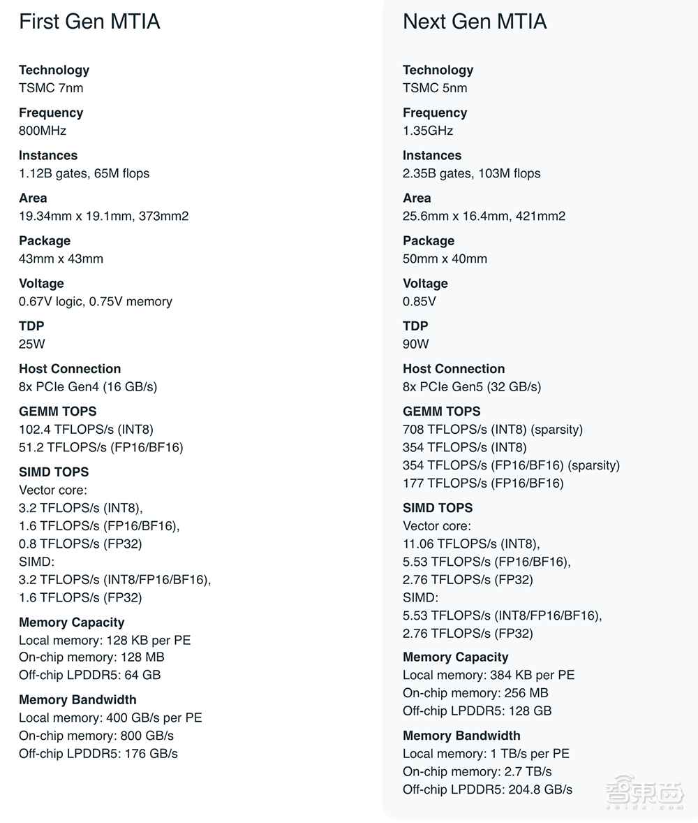 Meta去年5月推出的第一代MTIA v1采用台积电7nm芯片。MTIA v2则换上了台积电5nm,每PE缓存从上一代的128KB增加到384KB,频率从800MHz提升到1.35GHz,INT8精度下的稠密算力达到上一代的近3.5倍,稀疏算力达到上一代的近7倍,达到708TFLOPS。
